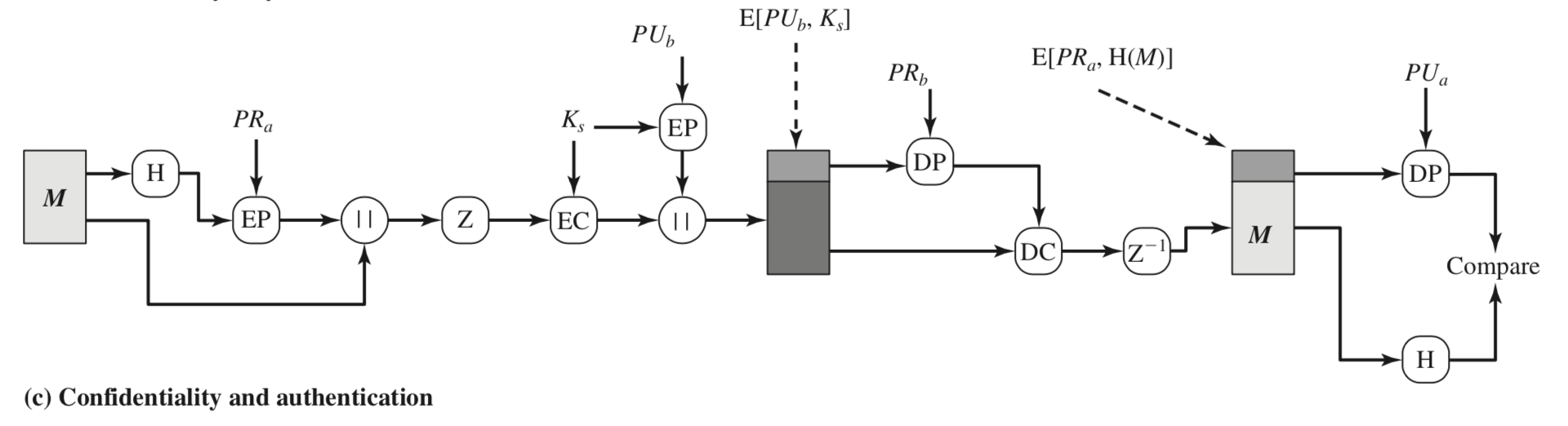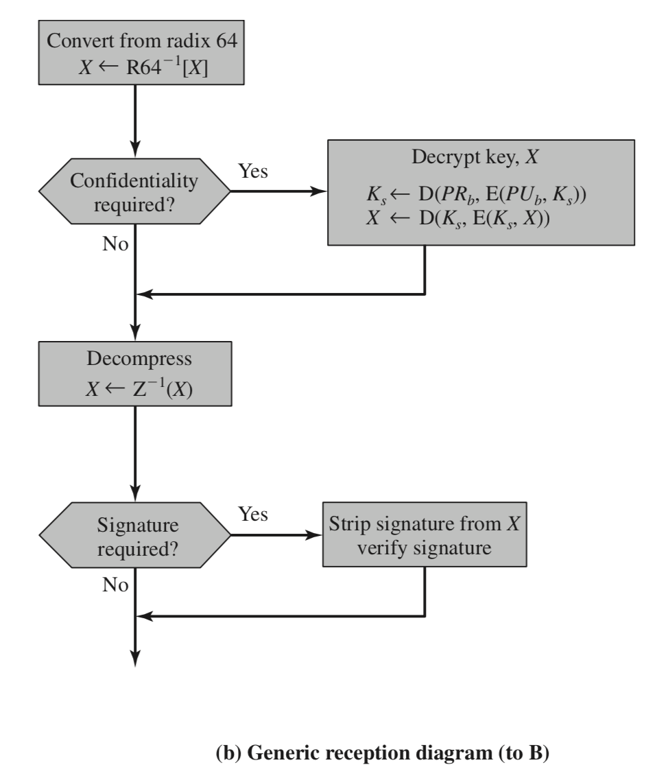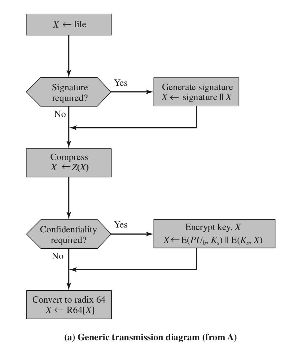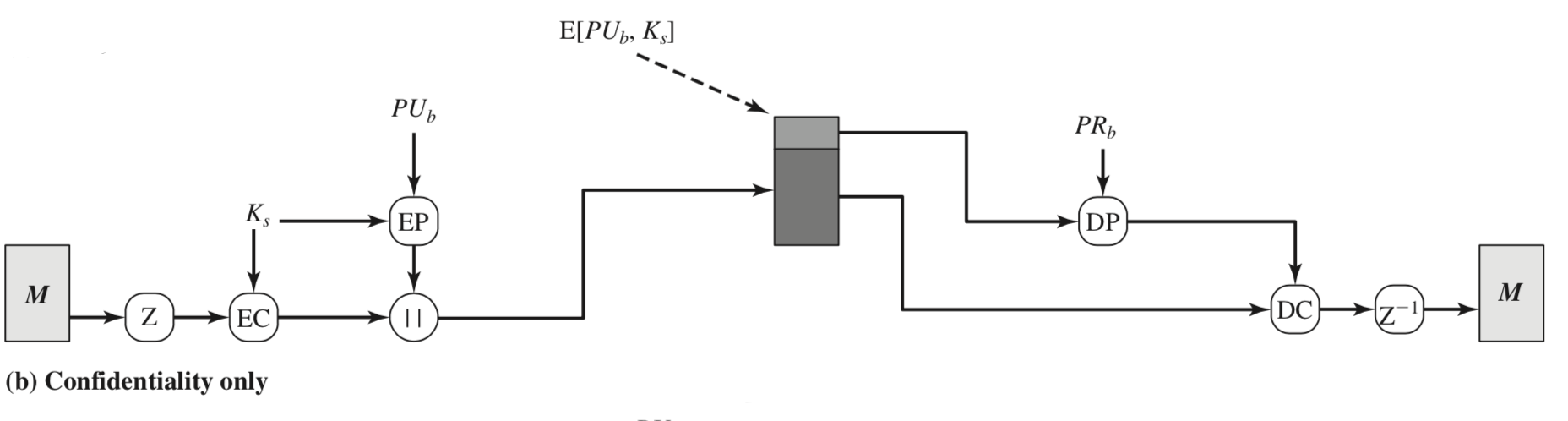| Message encryption | CAST or IDEA or Three-key Triple DES with Diffie-Hellman or RSA | Sender에 의해 생성된 one-time session key로 CAST-128, IDEA, 또는 3DES로 암호화 된다. 이 session key는 Diffe-Hellman이나 수신자의 RSA public key암호화 된다. |