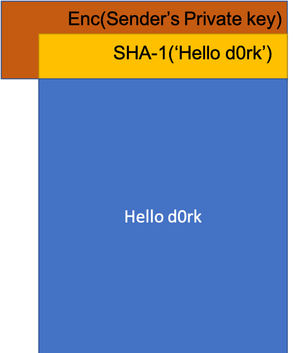 3. Sender의 Private-key를 이용하여 위의 (2)에서 만든 Hash code를 암호화 한다. (2)를 암호화 한 Hash code와 평문 메세지를 concatenation 한다. ※이때 Receiver가 Sender의 Public-key를 이용해서 복호화에 성공한다면, Authentication이 충족된다.